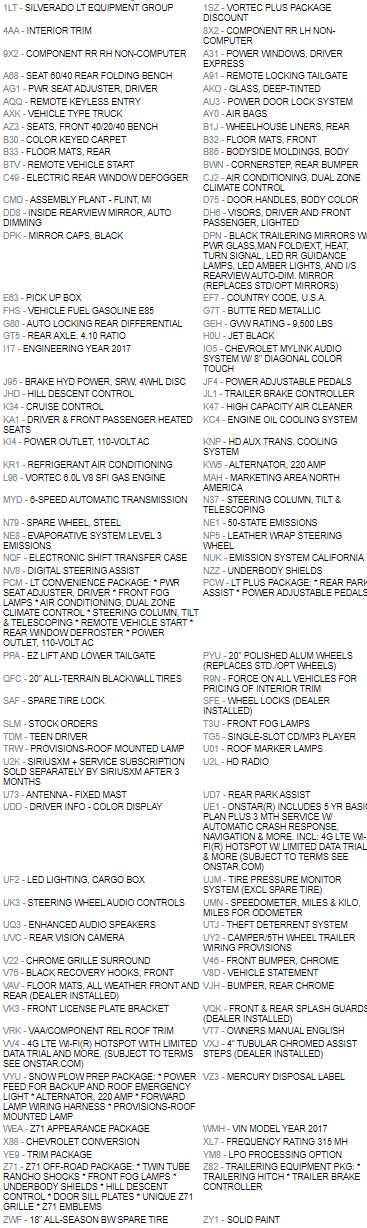 WHEELS, 20" 5-SPOKE POLISHED ALUMINUM includes 18" x 8" (45.7 cm x 20.3 cm) steel spare wheel. LT CONVENIENCE PACKAGE includes (AG1) driver 10-way power seat adjuster when ordered with (AZ3) bench seats only, (BTV) Remote vehicle starter system, (C49) rear-window defogger, (N37) manual tilt and telescoping steering column, (KI4) 110-volt power outlet, and (T3U) fog lamps. Crew Cab and Double Cab also includes (CJ2) dual-zone climate control. LT PLUS PACKAGE for Crew Cab and Double Cab, includes (UG1) Universal Home Remote, (UD7) Rear Park Assist, (JF4) power adjustable pedals, (A48) rear sliding power window and (C49) rear-window defogger, LPO, ASSIST STEPS - 4" CHROMED ROUND, TRAILERING EQUIPMENT Trailering hitch platform 2.5" with a 2.0" insert for HD, 7-wire harness with independent fused trailering circuits mated to a 7-way sealed connector to hook up parking lamps, backup lamps, right and left turn signals, an electric brake lead, battery and a ground, The trailer connector also includes the 4-way for use on trailers without brakes - park, brake/turn lamps Includes (JL1) trailer brake controller. Z71 PACKAGE, OFF-ROAD: includes twin tube Rancho brand shocks, (JHD) Hill Descent Control, (NZZ) underbody shields. Also includes brushed metal Z71 door sill plate, unique Z71 gauge cluster, unique finish interior trim plates, unique lower bumper appearance, unique grille design with Z71 badge and Z71 pickup box decals Includes (T3U) fog lamps. SEAT ADJUSTER, DRIVER 10-WAY POWER, MIRRORS, OUTSIDE HEATED POWER-ADJUSTABLE VERTICAL TRAILERING, UPPER GLASS, MANUAL-FOLDING AND EXTENDING, BLACK; Includes integrated turn signal indicators consisting of 51 square inch flat mirror surface positioned over a 24.5 square inch convex mirror surface with a common head and lower convex spotter glass (convex glass is not heated and not power adjustable) and addition of auxiliary cargo lamp for backing up (helps to see trailer when backing up with a trailer) and amber auxiliary clearance lamp (Includes (DD8) auto-dimming inside rearview mirror.), REMOTE VEHICLE STARTER SYSTEM Includes (UTJ) Theft-deterrent system.), SEATING, HEATED DRIVER AND FRONT PASSENGER, SNOW PLOW PREP PACKAGE: includes power feed for backup and roof emergency light, (KW5) 220-amp alternator with gas or diesel engine, forward lamp wiring harness, (TRW) provision for cab roof mounted lamp/beacon, (NZZ) underbody shields and Heavy-Duty front-springs, SEATS, FRONT 40/20/40 SPLIT-BENCH, 3-PASSENGER. Available in cloth or leather. Includes driver and front passenger recline with outboard head restraints and center fold-down armrest with storage. Also includes manually adjustable driver lumbar, lockable storage compartment in seat cushion, and storage pockets. (STD), REAR AXLE, 4.10 RATIO, AUDIO SYSTEM, CHEVROLET MYLINK RADIO WITH 8" DIAGONAL COLOR TOUCH-SCREEN, AM/FM STEREO with seek-and-scan and digital clock, includes Bluetooth® streaming audio for music and select phones; USB ports; auxiliary jack; voice-activated technology for radio and phone; and Shop with the ability to browse, select and install apps to your vehicle. Apps include Pandora, iHeartRadio, The Weather Channel and more. (STD), ENGINE, VORTEC 6.0L VARIABLE VALVE TIMING V8 SFI, E85-COMPATIBLE, FLEXFUEL capable of running on unleaded or up to 85% ethanol (360 hp [268.4 kW] @ 5400 rpm, 380 lb-ft of torque [515.0 N-m] @ 4200 rpm) (STD), TRANSMISSION, 6-SPEED AUTOMATIC, HEAVY-DUTY Keyless Entry, Privacy Glass, Steering Wheel Controls, Electronic Stability Control, Bed Liner. /